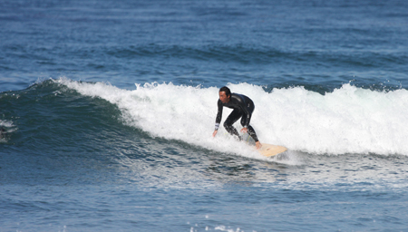 ふとカメラを沖に向けていたら、リラックススタイルでひと際目立つサーファーが目にとまった。 その風貌、そのライディングスタイル、その板の形。 |