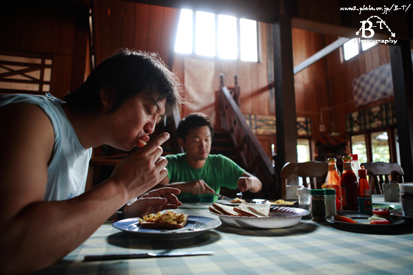 | DAY2 Part1(メダン〜シメルー島キャンプ到着) そんな騒音で苦しい夜も明けはじめ、早朝より出発準備を開始する。 山形を出発してからなんだかんだで忙しく行動していて、てっちゃんは若干お疲れ気味のようだ。 でも、これだけ一緒に行動をともにしてみると、今まではしなかったような話もでてきたり、 意外な一面も見えたりするのが、すごく新鮮で、numa!なんて普段めったに会わないのでなおさら。 そんなことでも、すでにこのTripは実に楽しく感じるものです。 |